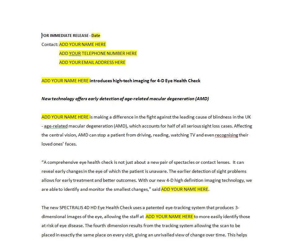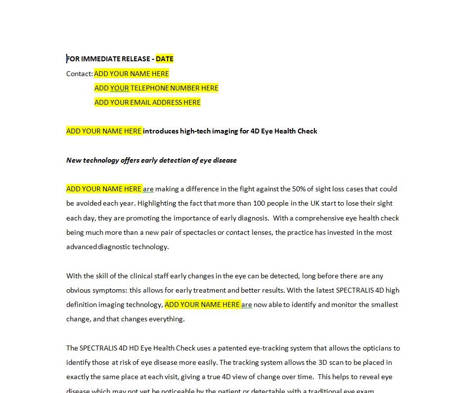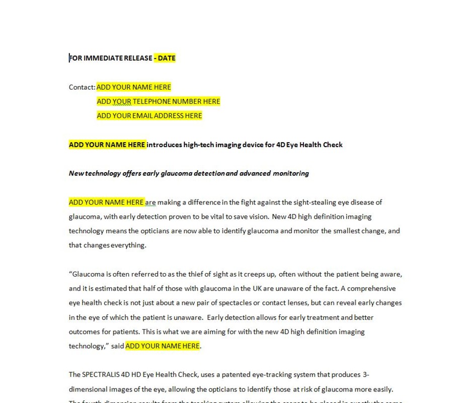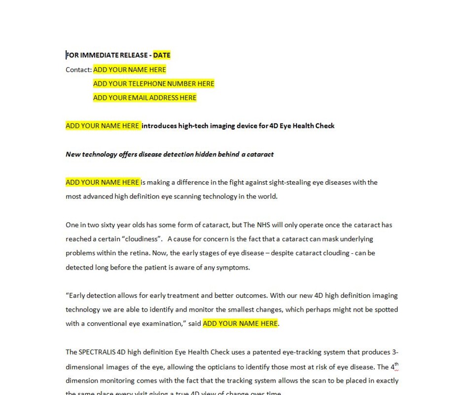 Investing in a SPECTRALIS is the perfect opportunity to gain the attention of local media. This unique 4D HD technology differentiates you from every other practice on the High Street. Whether or not you have a relationship with your local newspaper or magazine, this level of investment and your ability to improve the lives of your patients should be of interest to your local editor or reporter. These press releases customised with your practice information can give you the confidence to make contact and provide the newspaper with material to create a story.