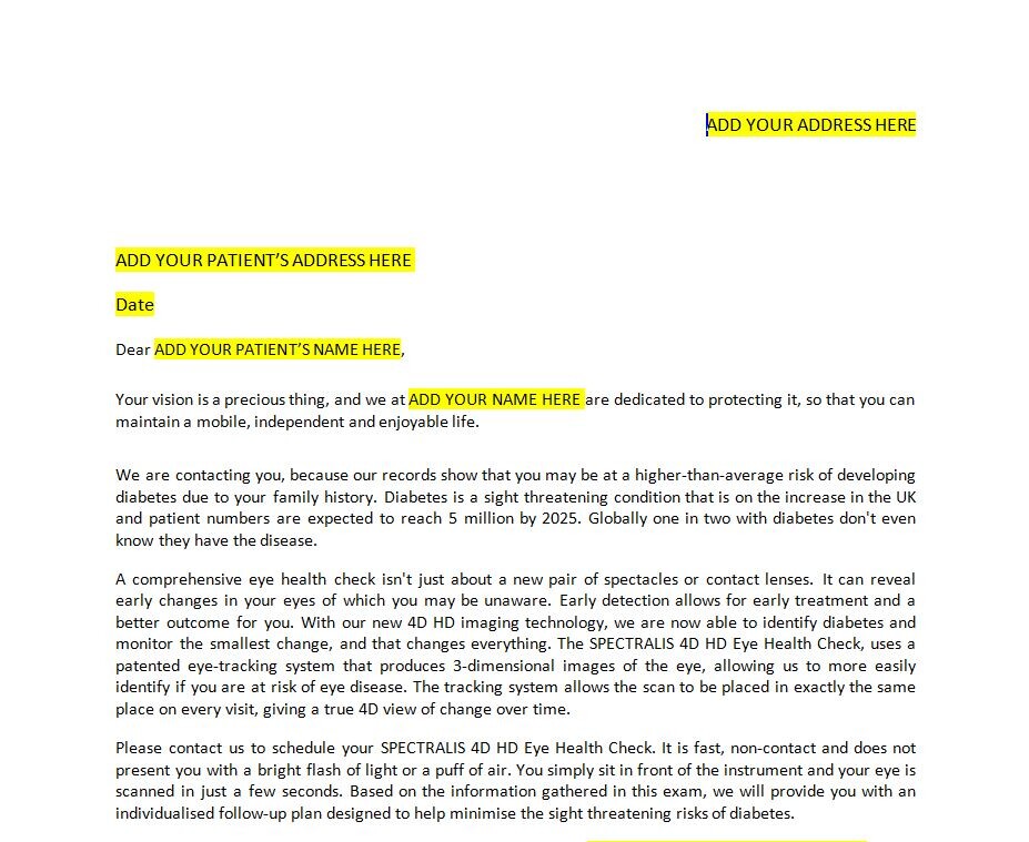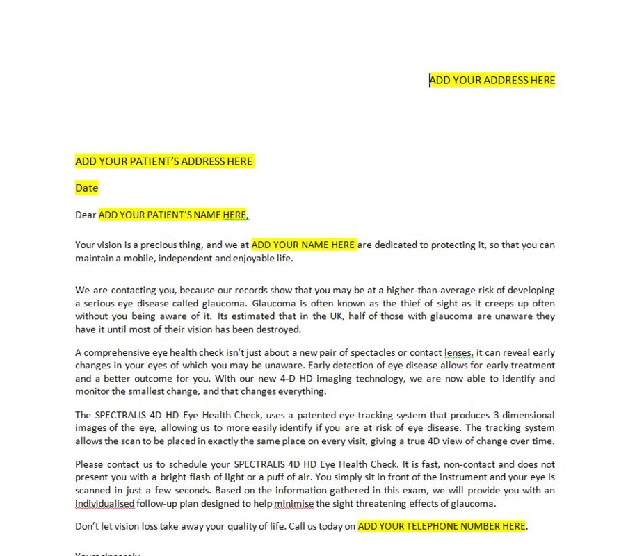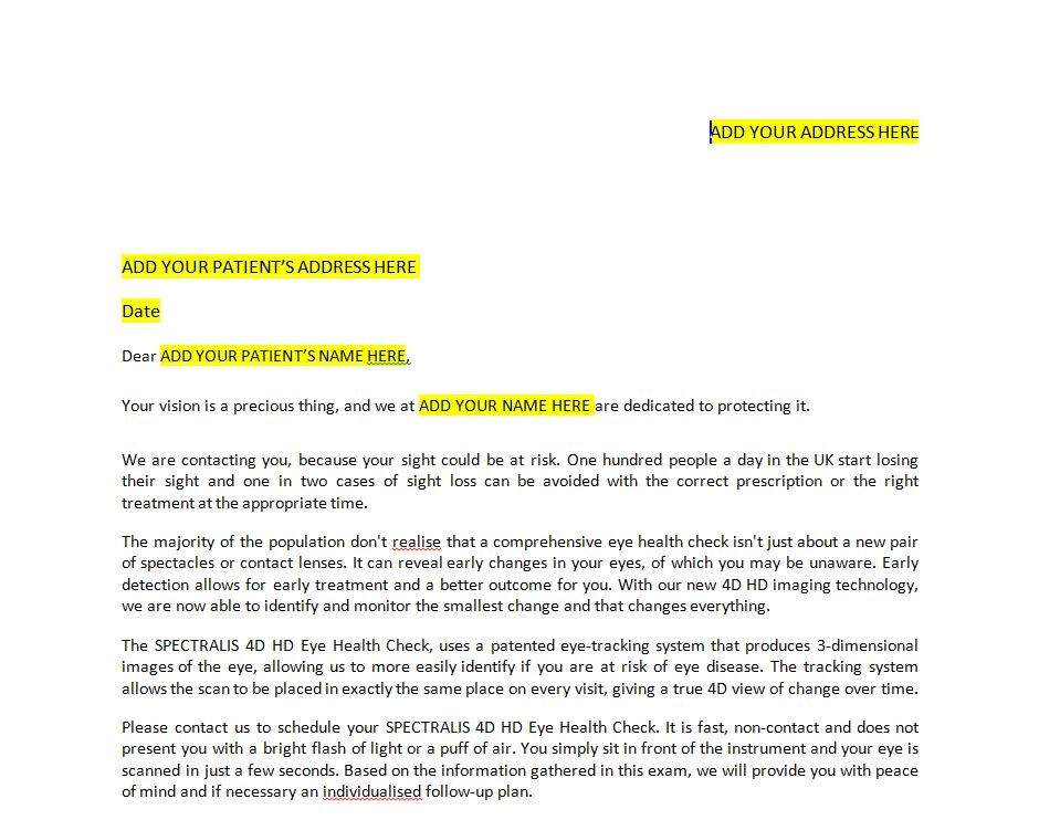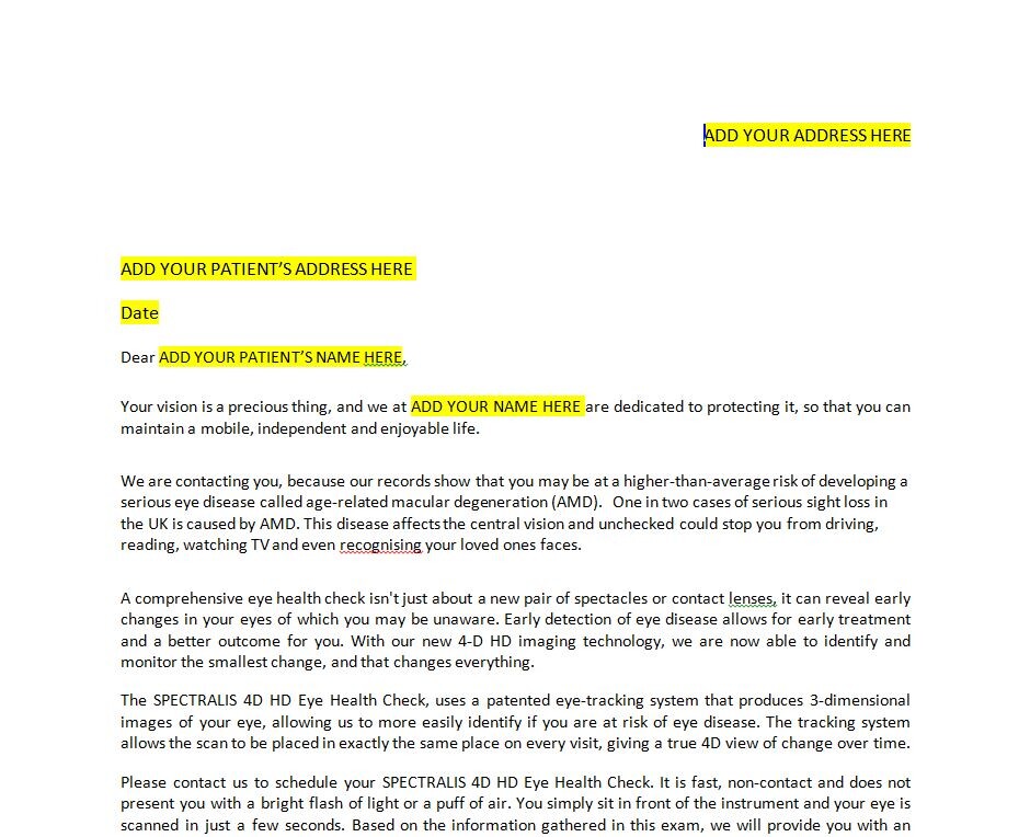 Reminder letters are a main stay for any optometric practice. It is important to ensure that your patients know that their eyes are important to you and that you are investing in your practice to provide improved patient care. These reminder letters allow you to use the power of your patient database to target age and risk groups and demonstrate that you offer individualised treatment. We provide the letters in Microsoft Word format so that they are easily editable and can be printed on your own letterhead and branded style.